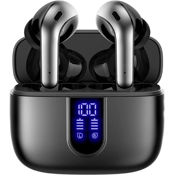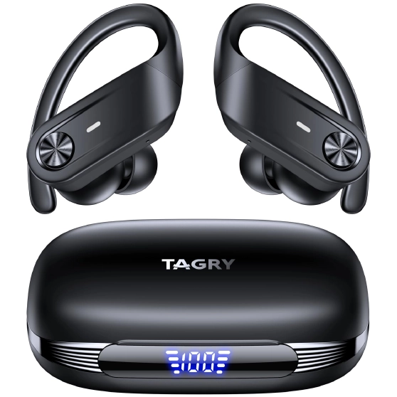 TAGRY Bluetooth earbuds with 60H playback, LED power display, and wireless charging case. IPX5 waterproof in-ear headphones with mic for sports, phone, TV, and laptop.